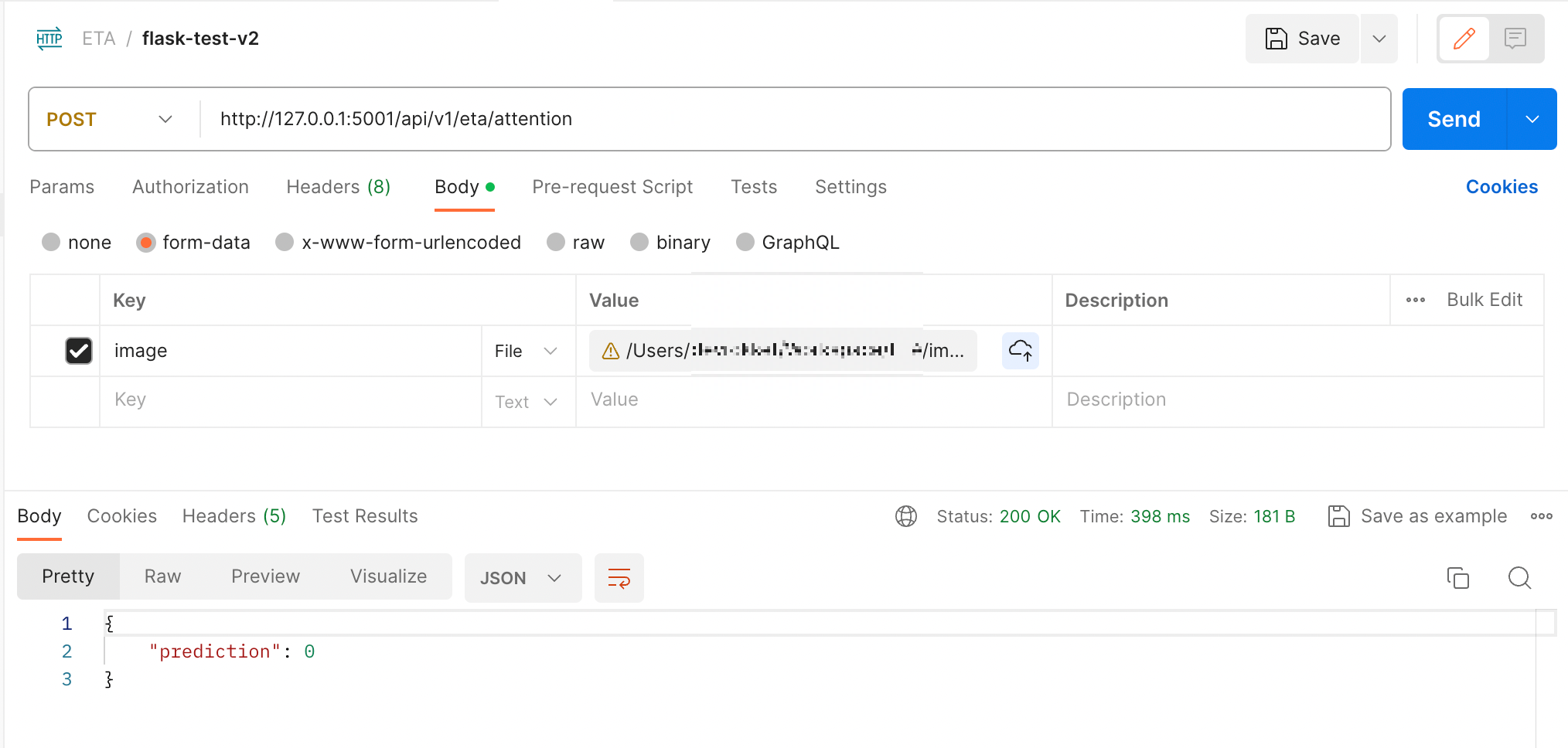 app.py에 작성했던 url로 form data 형식으로 이미지를 전송했을 때 json 형식으로 output이 반환됨을 확인할 수 있다.